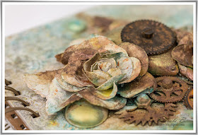J'ai coloré le fond avec une encre Moonshadows et des poudres Magical harmonisé avec les couleurs de la photo. J'ai également ajouté quelques tampons ici et là.